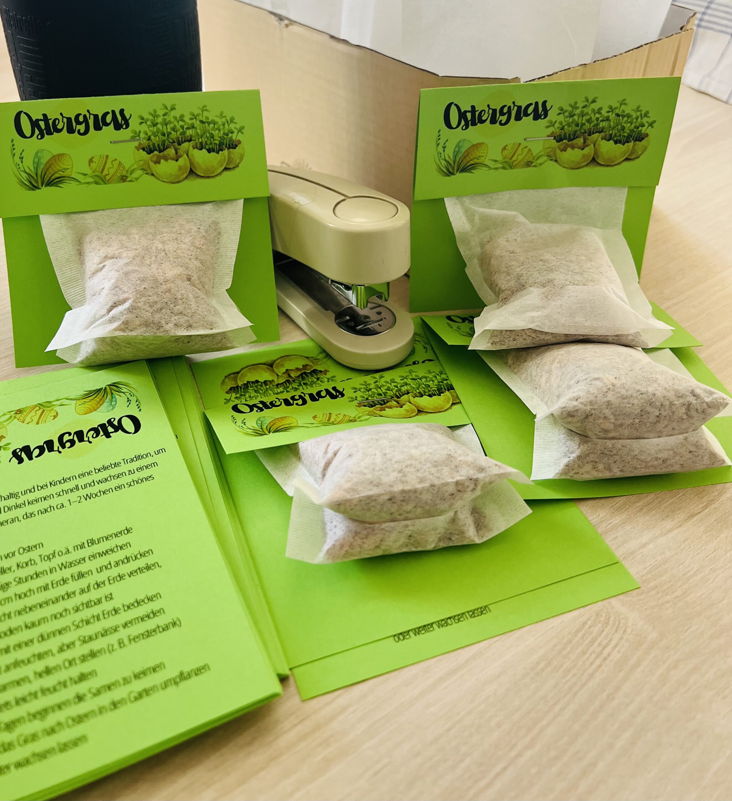 Ich habe eine Druckvorlage mit einer Anleitung für das Ostergras togo erstellt. Einfach ausdrucken, auf A6 zuschneiden und die oberen 4,35 cm umknicken. Die Körner in Teefilter oder Brottüten füllen und die Öffnung ein paar mal falten. Dann die Anleitung aufklappen, die Korntüte dazwischen platzieren, zurückklappen und mit einem Hefter verschließen.